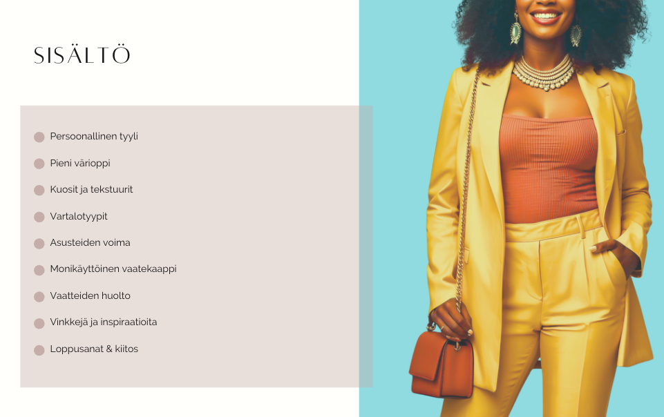 Tämä pieni ja värikäs inspiraatiopaketti on sinulle, joka haluat oppia rakentamaan toimivia, tasapainoisia ja oman näköisiä asukokonaisuuksia ilman säätöä ja stressiä. Käymme läpi pienen väriopin, asioita kuoseista ja tekstuureista, vartalotyypit sekä asusteet juuri niin käytännönläheisesti, että opit soveltamaan asioita heti omassa arjessa.