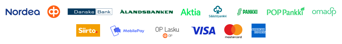 Maksutavat: Suomalaisten yleisimpien pankkien verkkopankkimaksut, Siirto, MobilePay, OP Lasku ja luottokortit (Visa, Mastercard ja Amex)